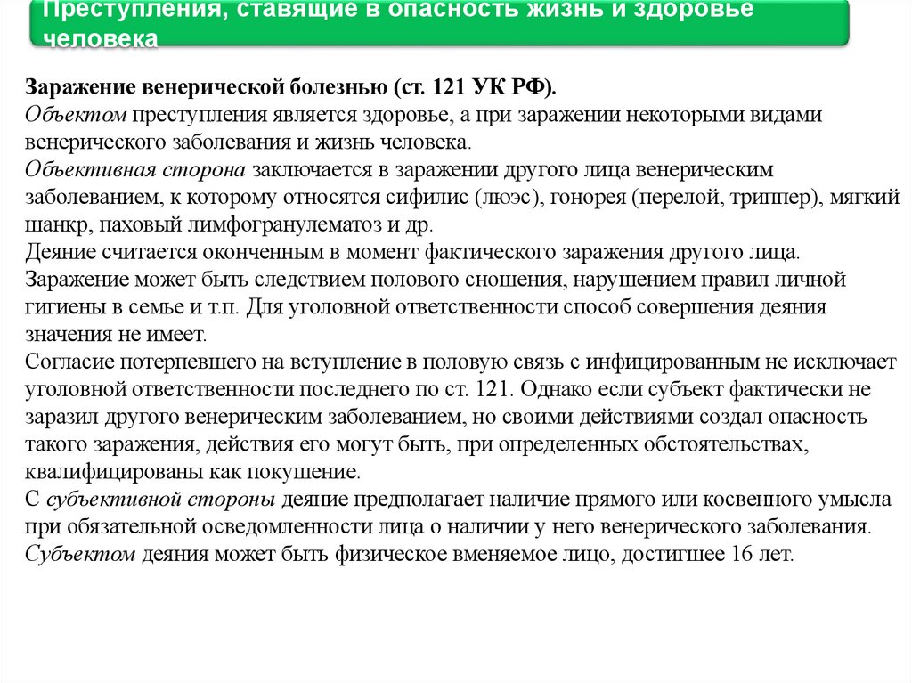 2. Заражение венерической болезнью (ст. 121 УК РФ).
