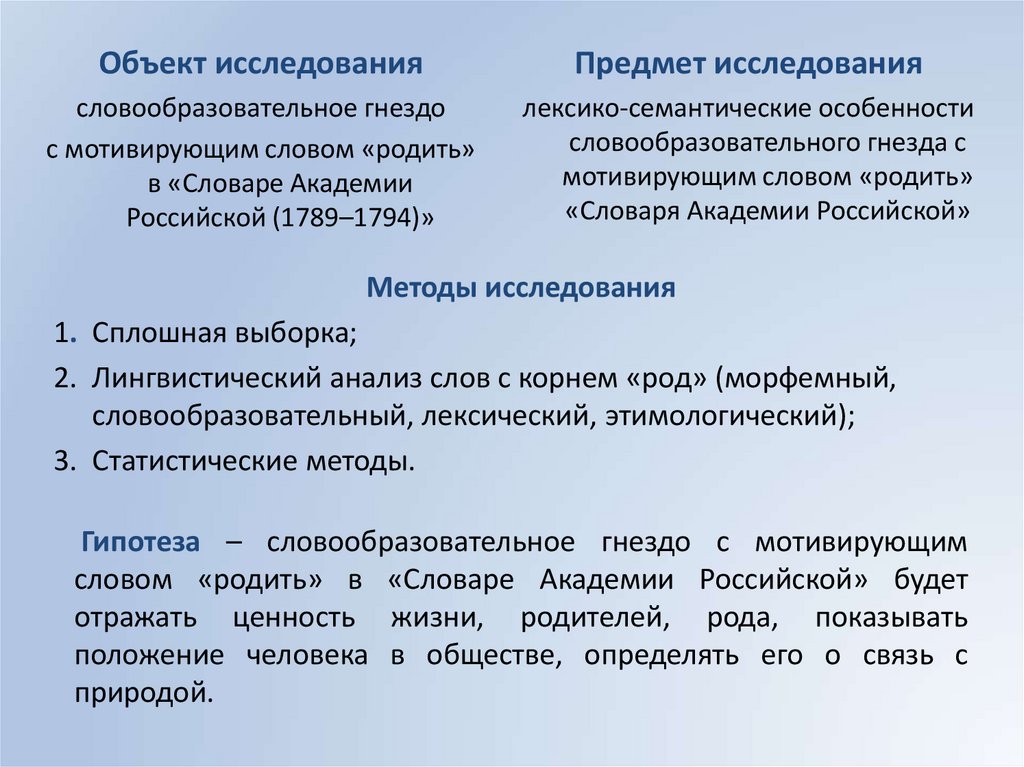 2. Цель работы – анализ словообразовательного гнезда с мотивирующим словом «родить» в русском языке конца XVIII века на основе