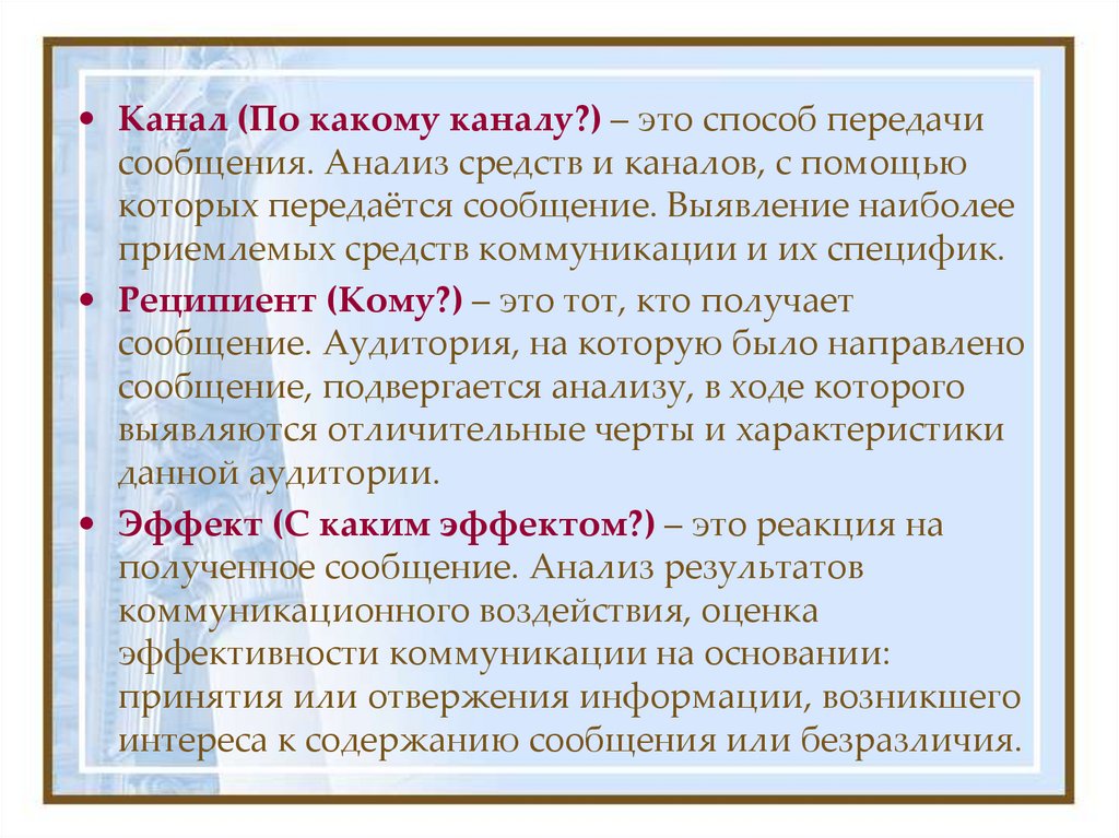 • Канал (По какому каналу?) – это способ передачисообщения. Анализ средств и каналов, с помощью