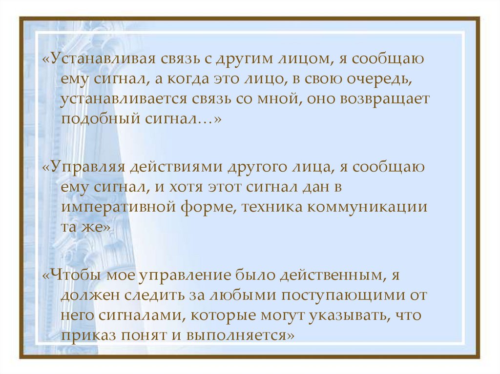 «Устанавливая связь с другим лицом, я сообщаюему сигнал, а когда это лицо, в свою очередь,
