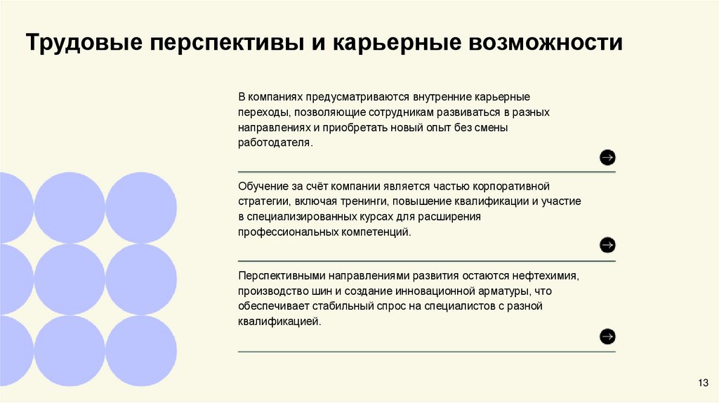 Трудовые перспективы и карьерные возможностиВ компаниях предусматриваются внутренние карьерные