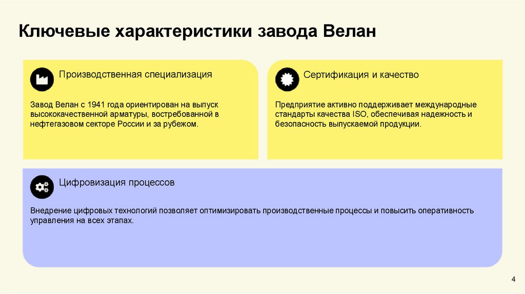 Ключевые характеристики завода ВеланПроизводственная специализация