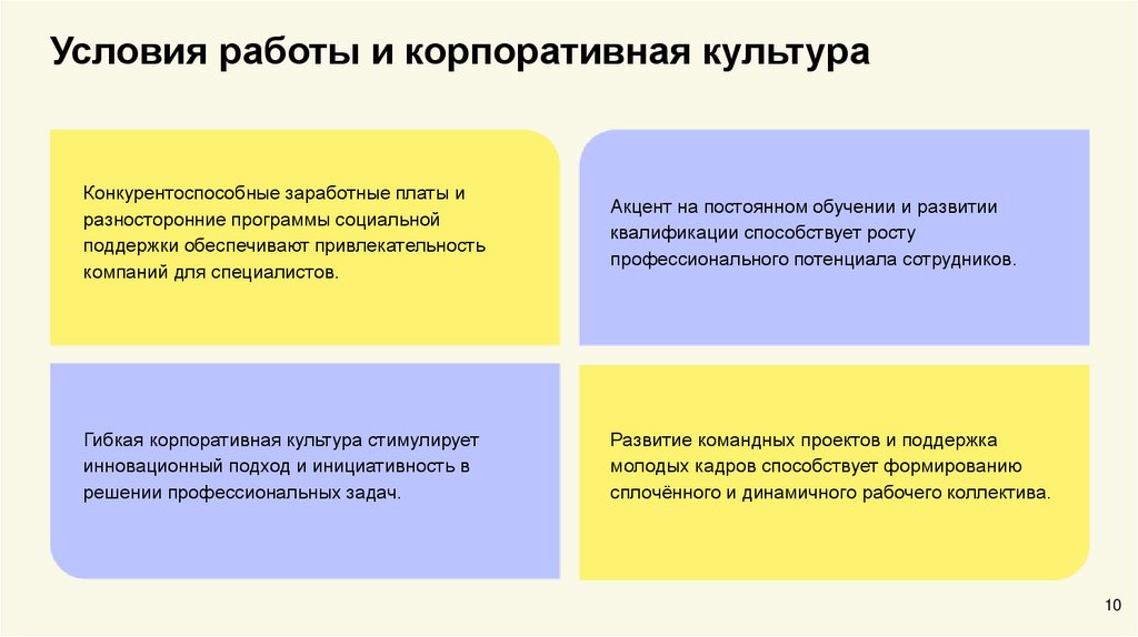 Условия работы и корпоративная культураКонкурентоспособные заработные платы и