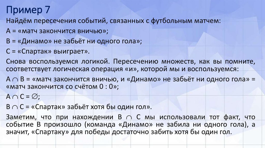 Пример 7Найдём пересечения событий, связанных с футбольным матчем: