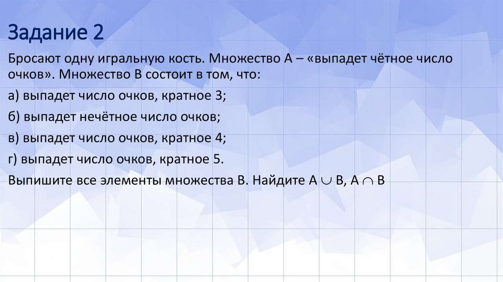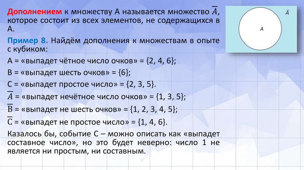 А = «выпадет чётное число очков» = {2, 4, 6};