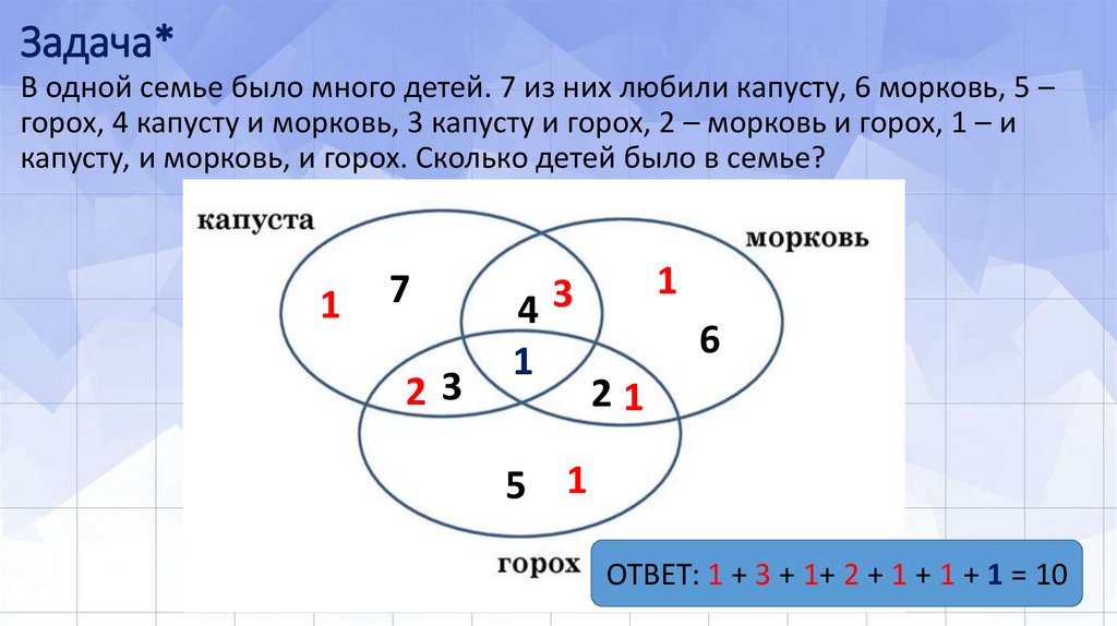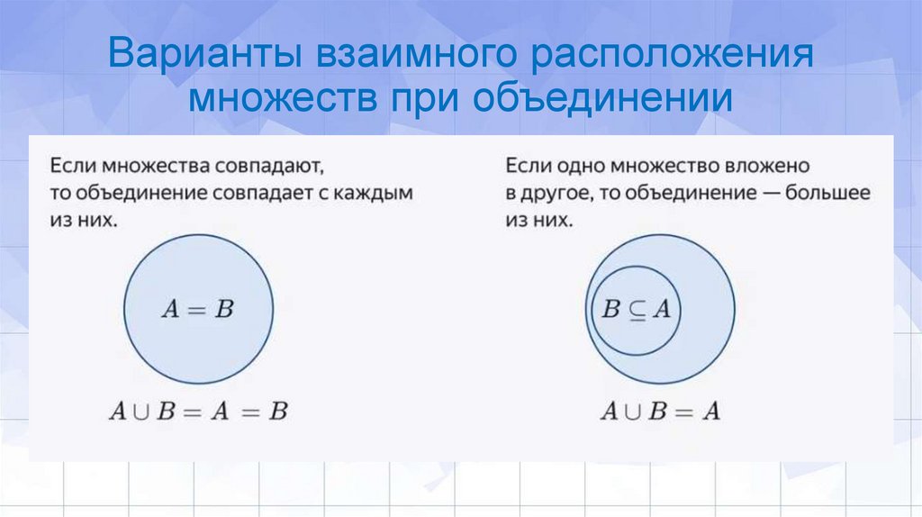 Заметим, что при объединении множеств общие элементы множеств не повторяются.