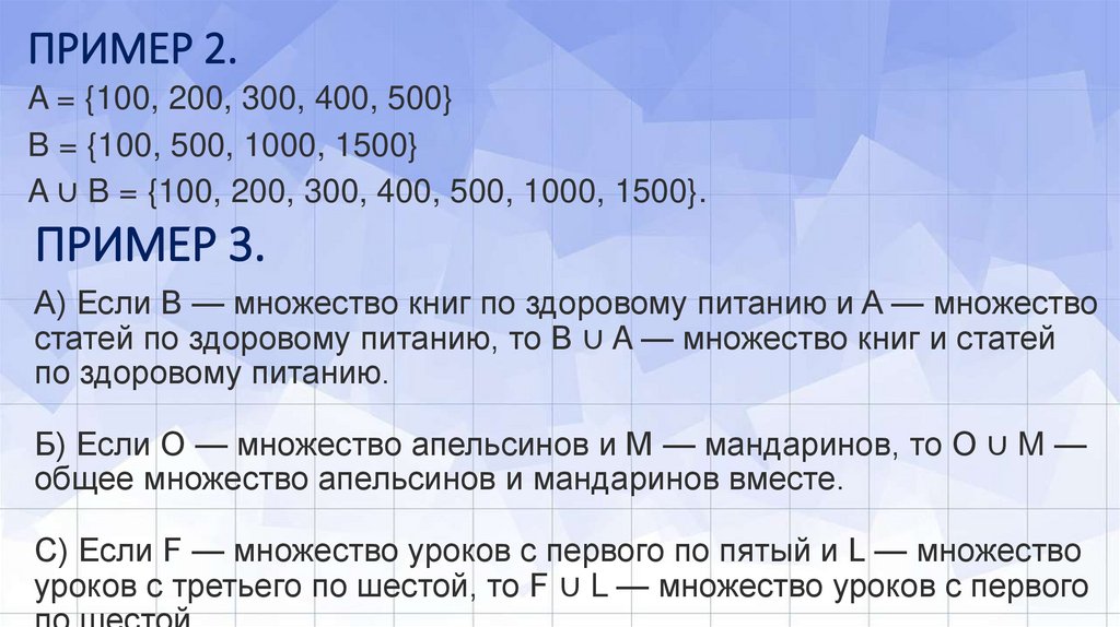 статей по здоровому питанию, то B ∪ A — множество книг и статей