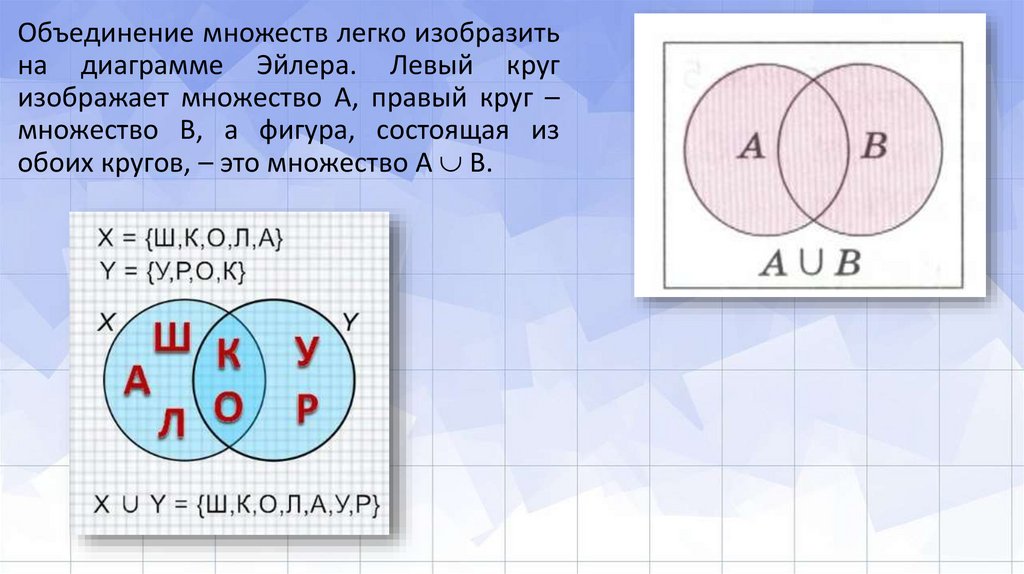 Объединение множеств легко изобразитьна диаграмме Эйлера. Левый круг