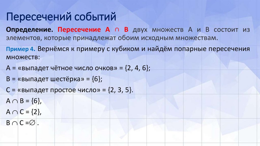 Пересечений событийОпределение. Пересечение A ∩ B двух множеств A и B состоит из