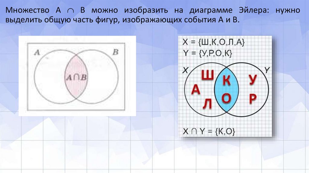Множество А В можно изобразить на диаграмме Эйлера: нужновыделить общую часть фигур, изображающих события А и В.