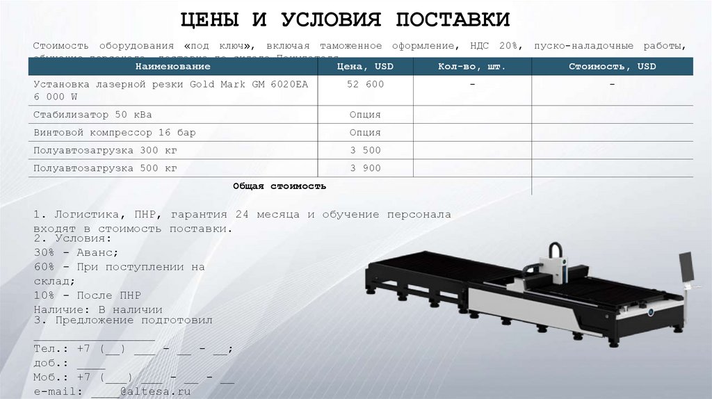 ЦЕНЫ И УСЛОВИЯ ПОСТАВКИСтоимость оборудования «под ключ», включая таможенное оформление, НДС 20%, пуско-наладочные работы,