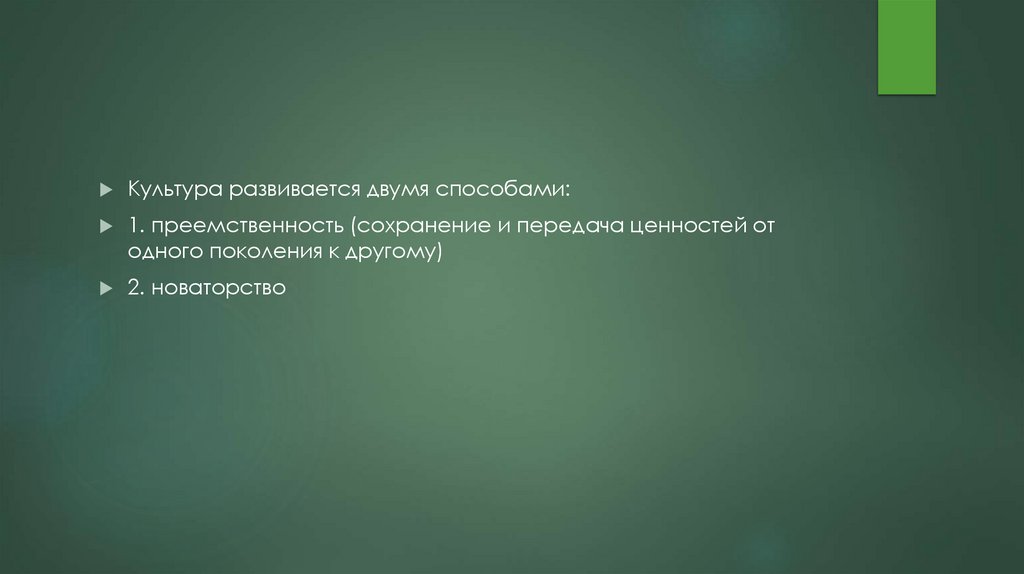 Культура развивается двумя способами:1. преемственность (сохранение и передача ценностей от