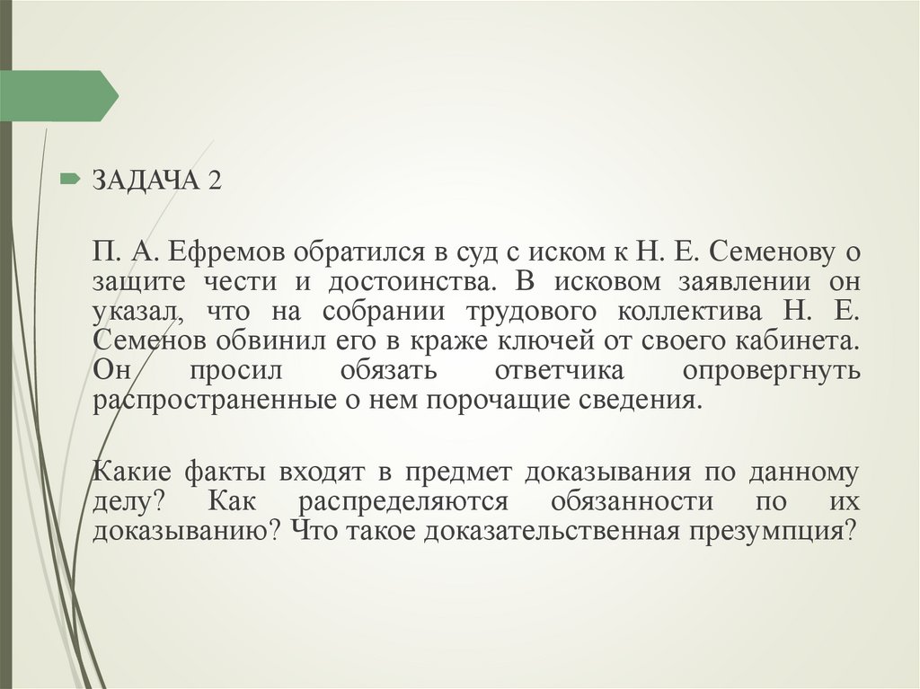 ЗАДАЧА 2П. А. Ефремов обратился в суд с иском к Н. Е. Семенову о