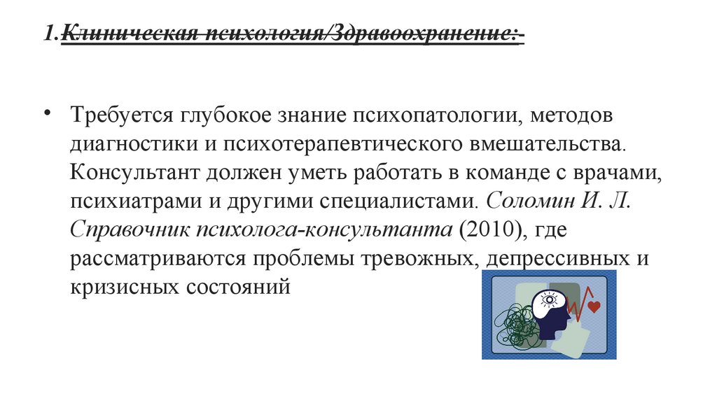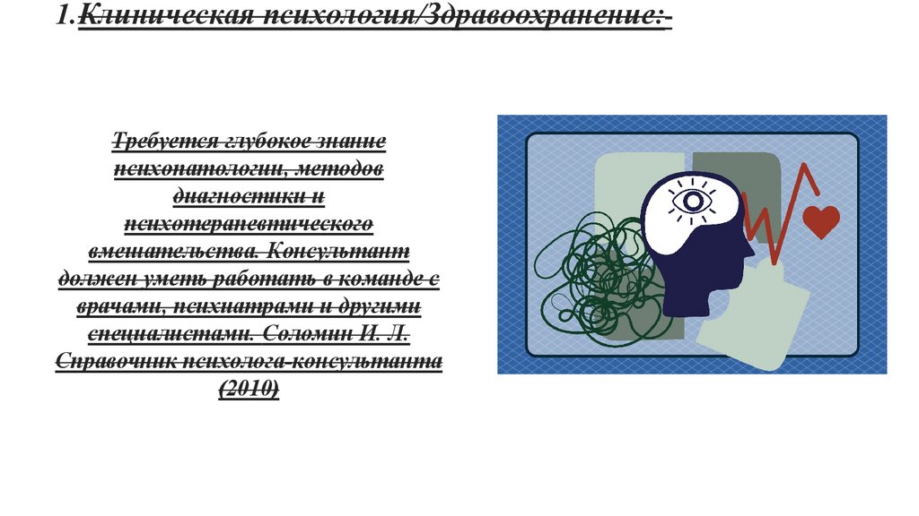 1.Клиническая психология/Здравоохранение:• Требуется глубокое знание психопатологии, методов