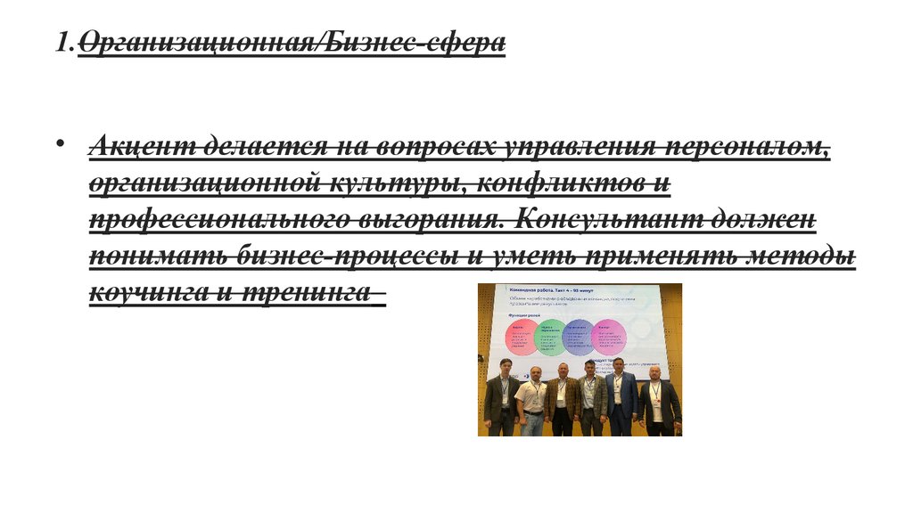 1.Организационная/Бизнес-сфера• Акцент делается на вопросах управления персоналом,
