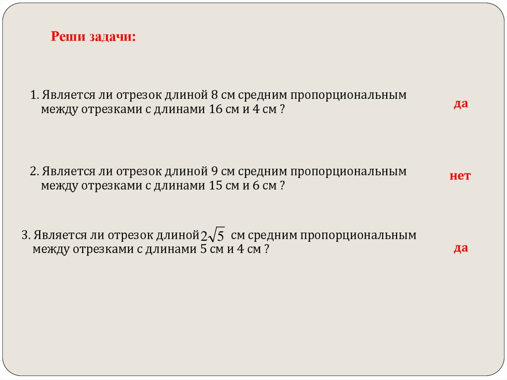 Реши задачи:1. Является ли отрезок длиной 8 см средним пропорциональным