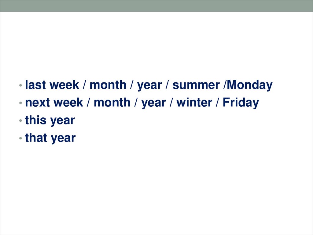 • last week / month / year / summer /Monday• next week / month / year / winter / Friday