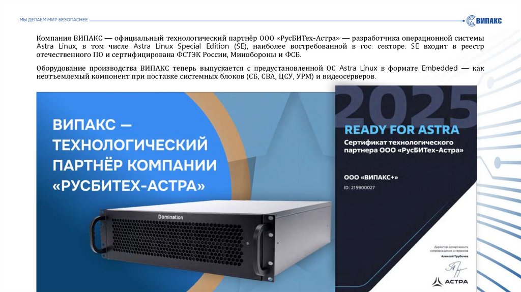 Компания ВИПАКС — официальный технологический партнёр ООО «РусБИТех-Астра» — разработчика операционной системыAstra Linux, в том числе Astra Linux Special Edition (SE), наиболее востребованной в гос. секторе. SE входит в реестр