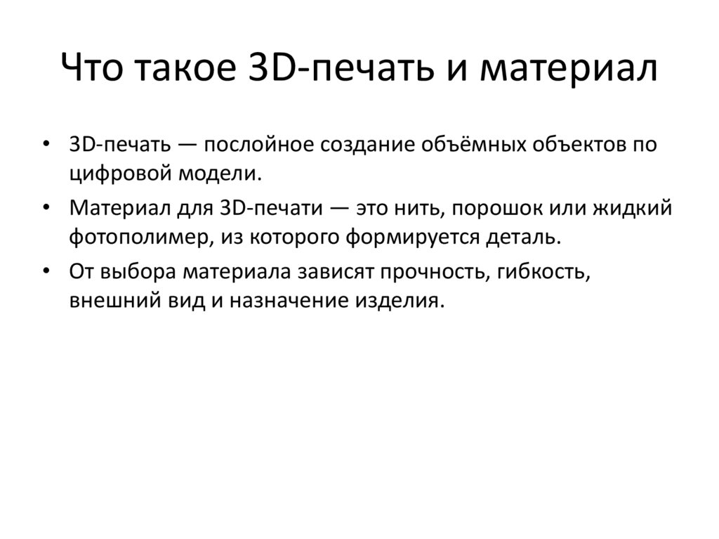 Что такое 3D-печать и материал• 3D-печать — послойное создание объёмных объектов по