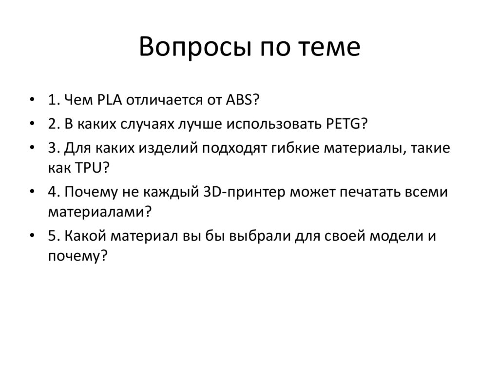 Вопросы по теме• 1. Чем PLA отличается от ABS?