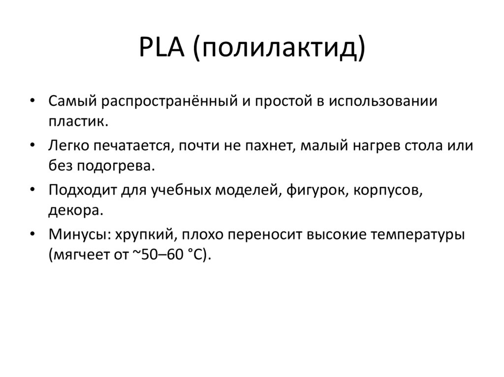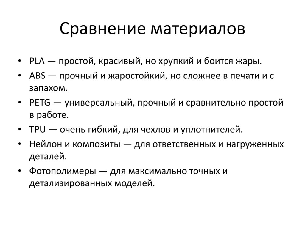 Сравнение материалов• PLA — простой, красивый, но хрупкий и боится жары.