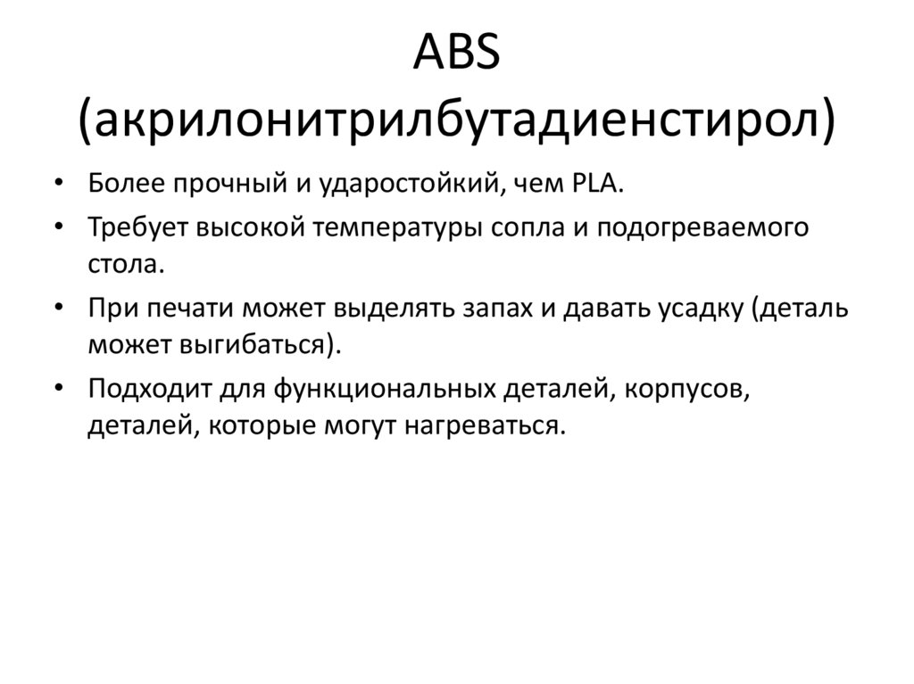 • ABS — прочный и жаростойкий, но сложнее в печати и с