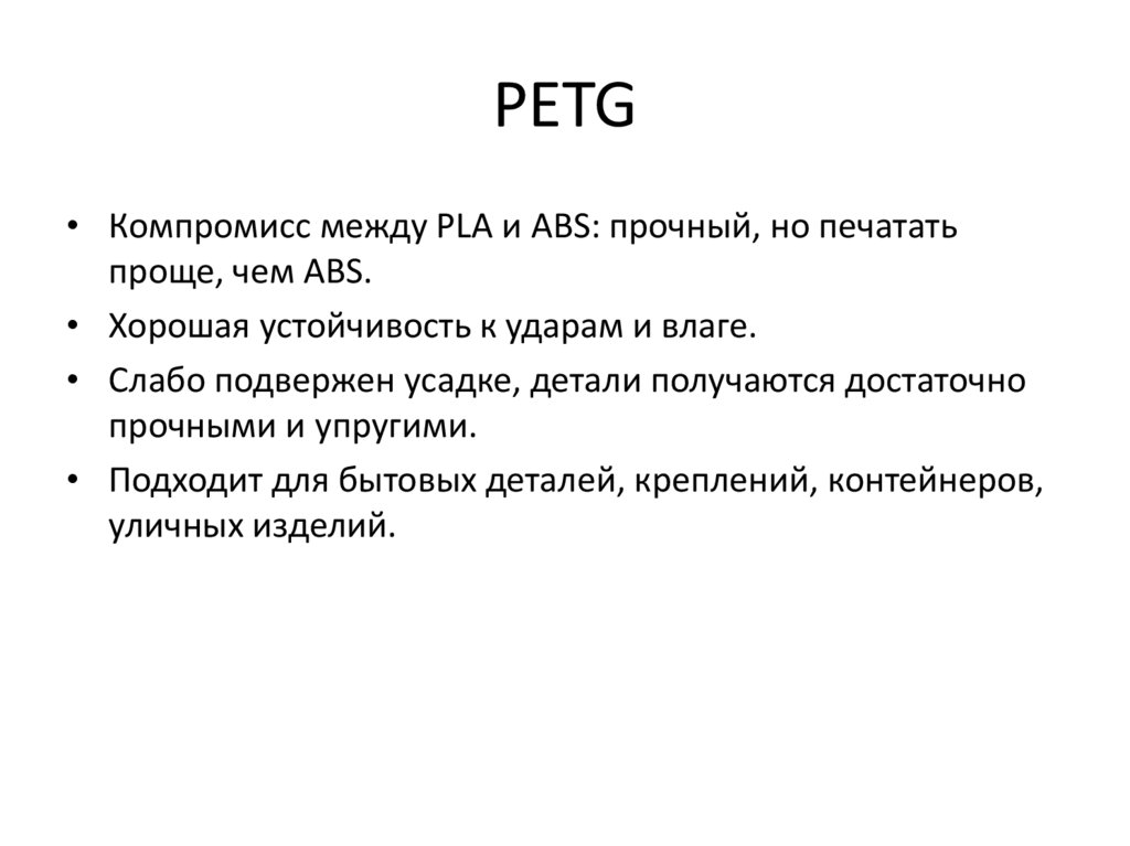PETG• Компромисс между PLA и ABS: прочный, но печатать