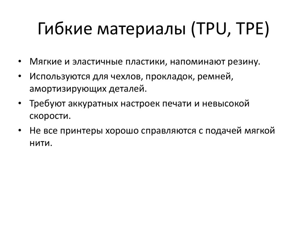 Гибкие материалы (TPU, TPE)• Мягкие и эластичные пластики, напоминают резину.