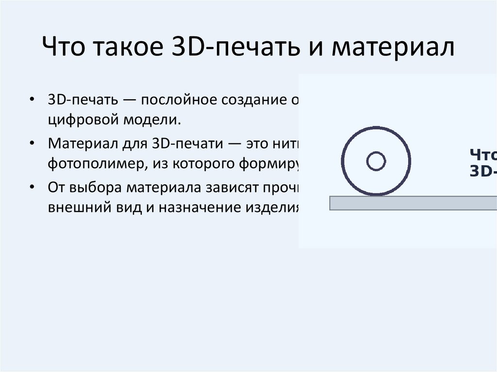 Что такое 3D-печать и материал• 3D-печать — послойное создание объёмных объектов по