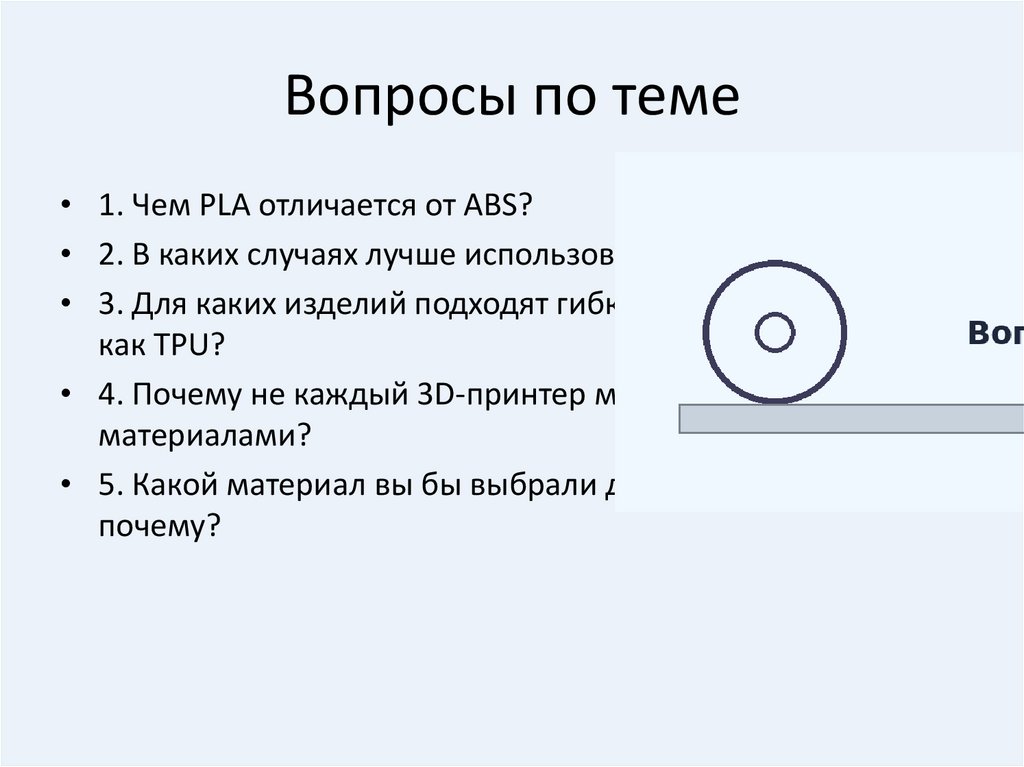 Вопросы по теме• 1. Чем PLA отличается от ABS?