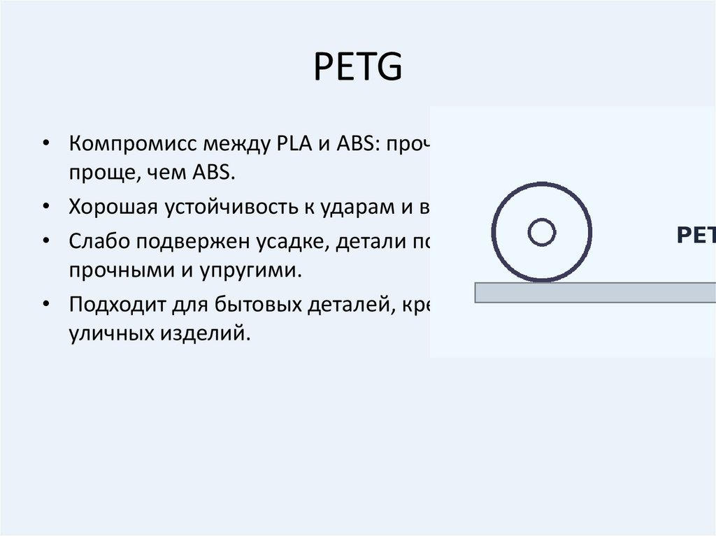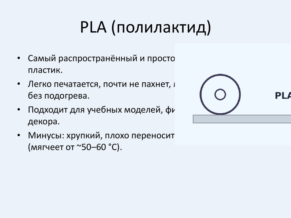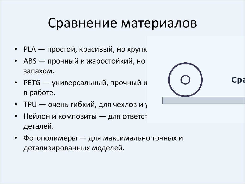 Сравнение материалов• PLA — простой, красивый, но хрупкий и боится жары.
