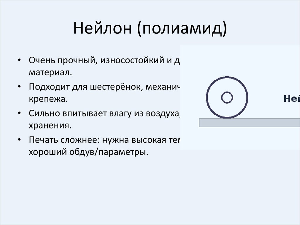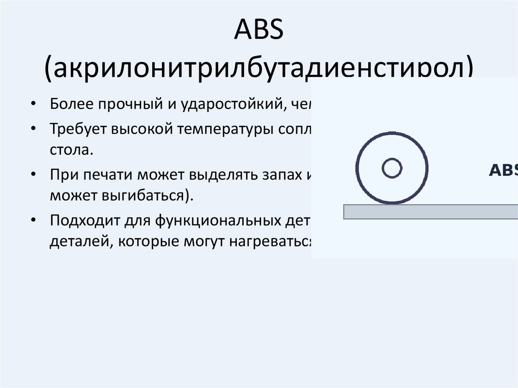 • ABS — прочный и жаростойкий, но сложнее в печати и с