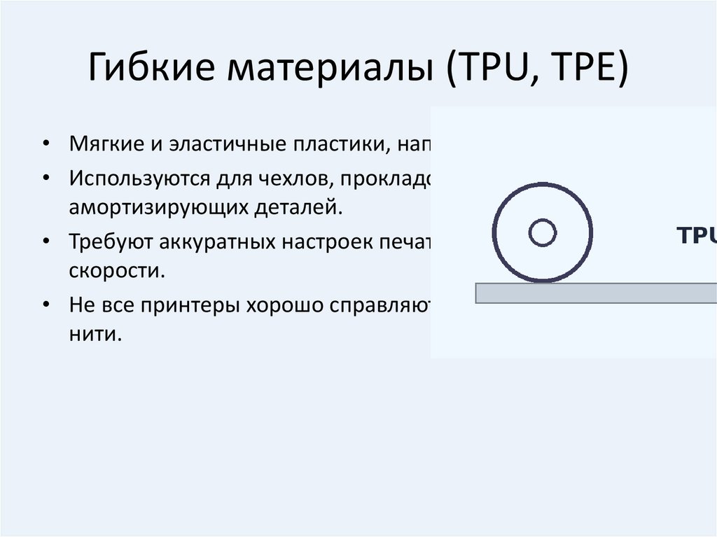 • TPU — очень гибкий, для чехлов и уплотнителей.