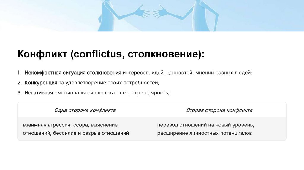 Конфликт (conflictus, столкновение):1. Некомфортная ситуация столкновения интересов, идей, ценностей, мнений разных людей;