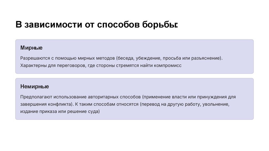 Разрешаются с помощью мирных методов (беседа, убеждение, просьба или разъяснение).