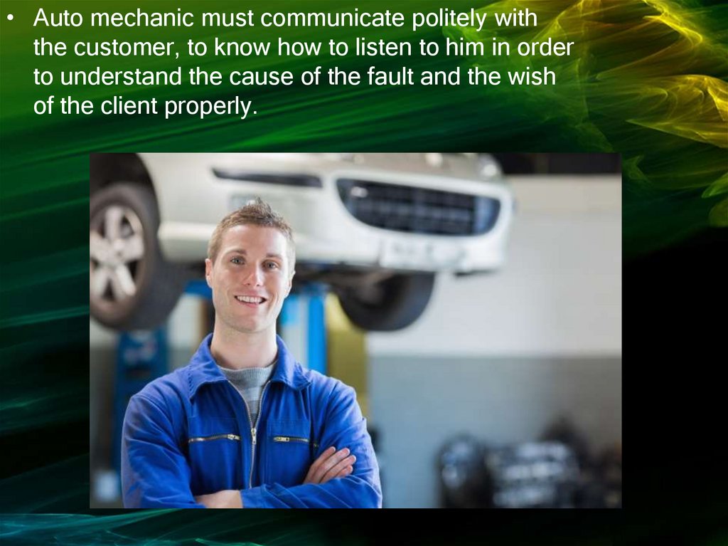 • Auto mechanic must communicate politely withthe customer, to know how to listen to him in order