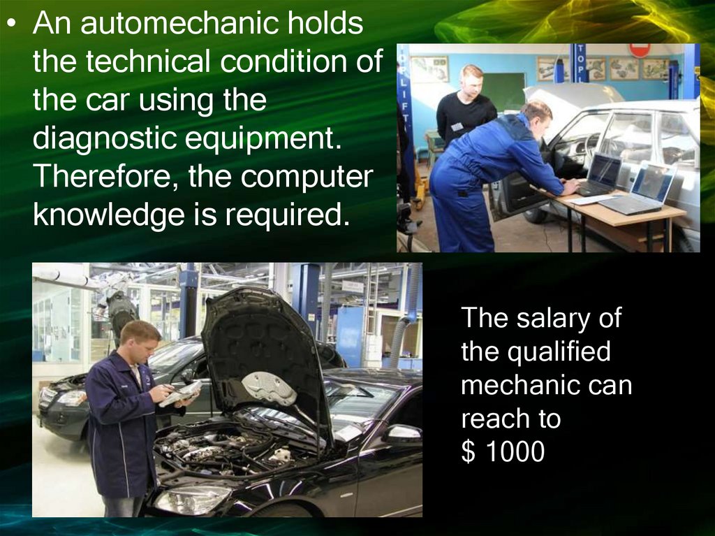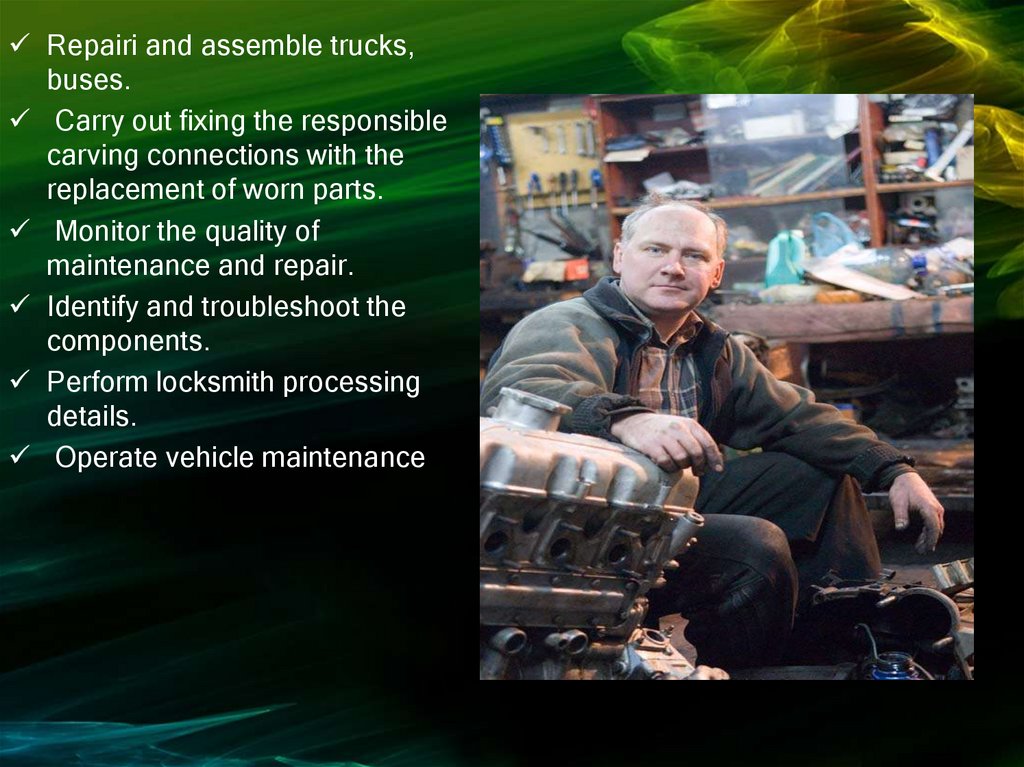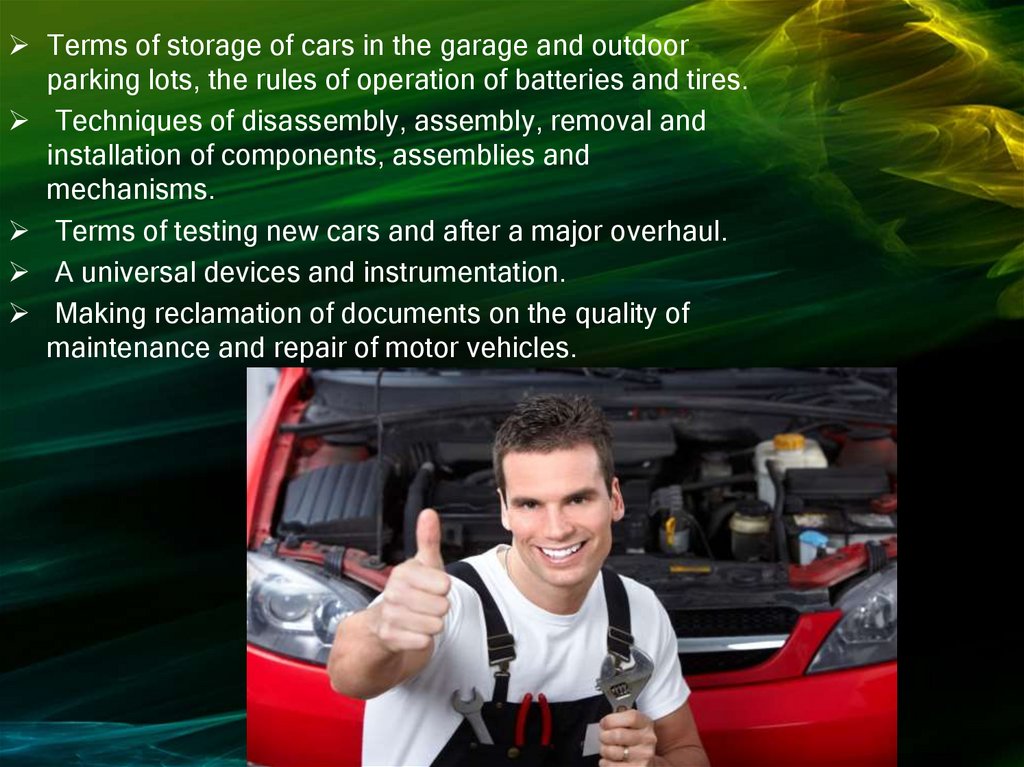 2. Auto mechanic is a working specialist who performs maintenance and repair motor vehicles, supervises the technical condition of