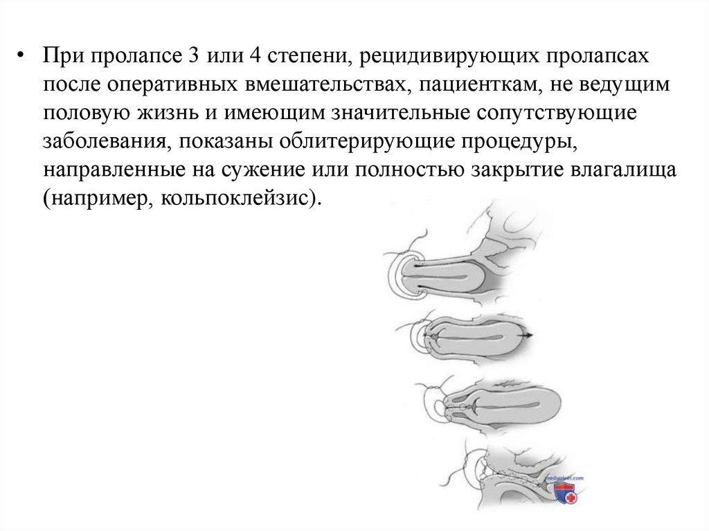 • При пролапсе 3 или 4 степени, рецидивирующих пролапсахпосле оперативных вмешательствах, пациенткам, не ведущим