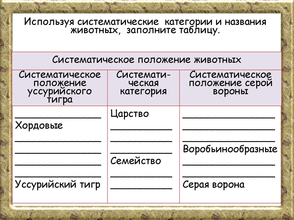 Используя систематические категории и названияживотных, заполните таблицу.