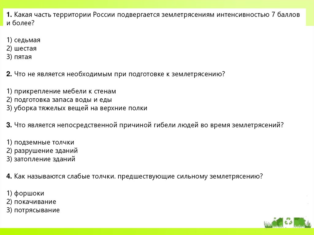 1. Какая часть территории России подвергается землетрясениям интенсивностью 7 баллови более?