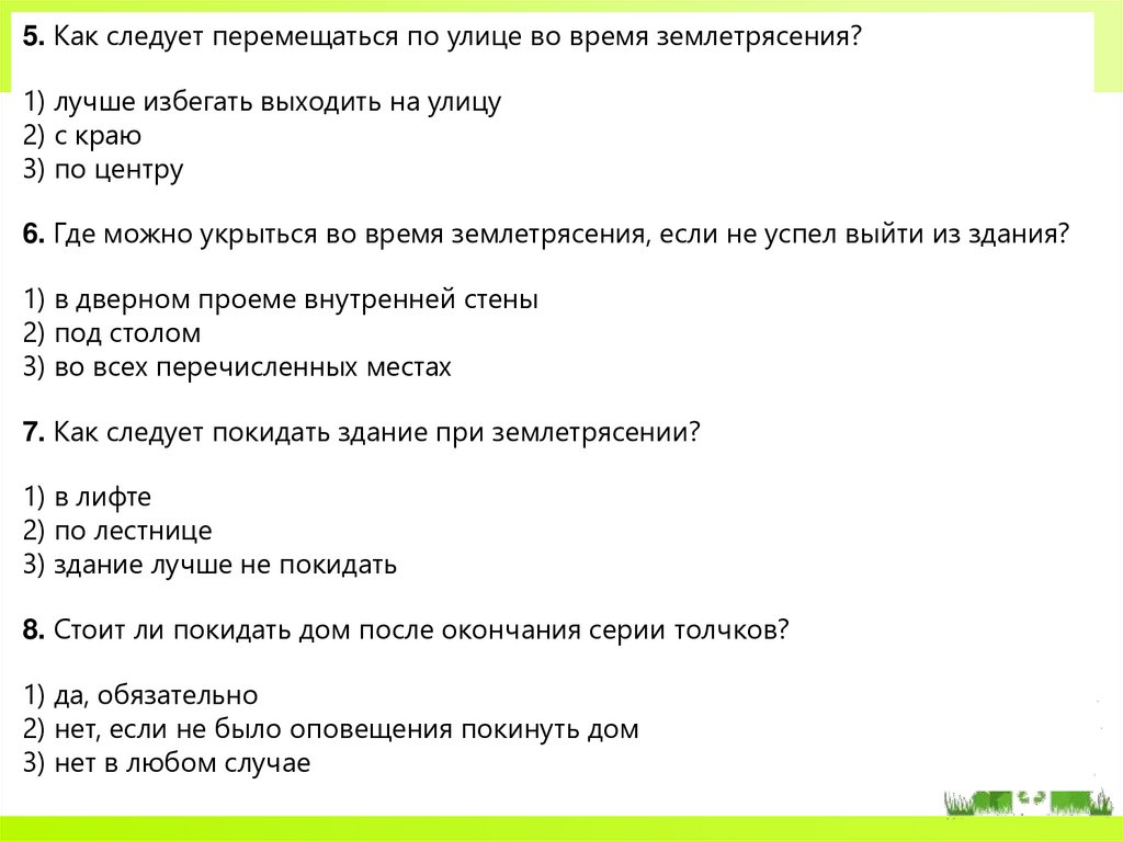 5. Как следует перемещаться по улице во время землетрясения?1) лучше избегать выходить на улицу