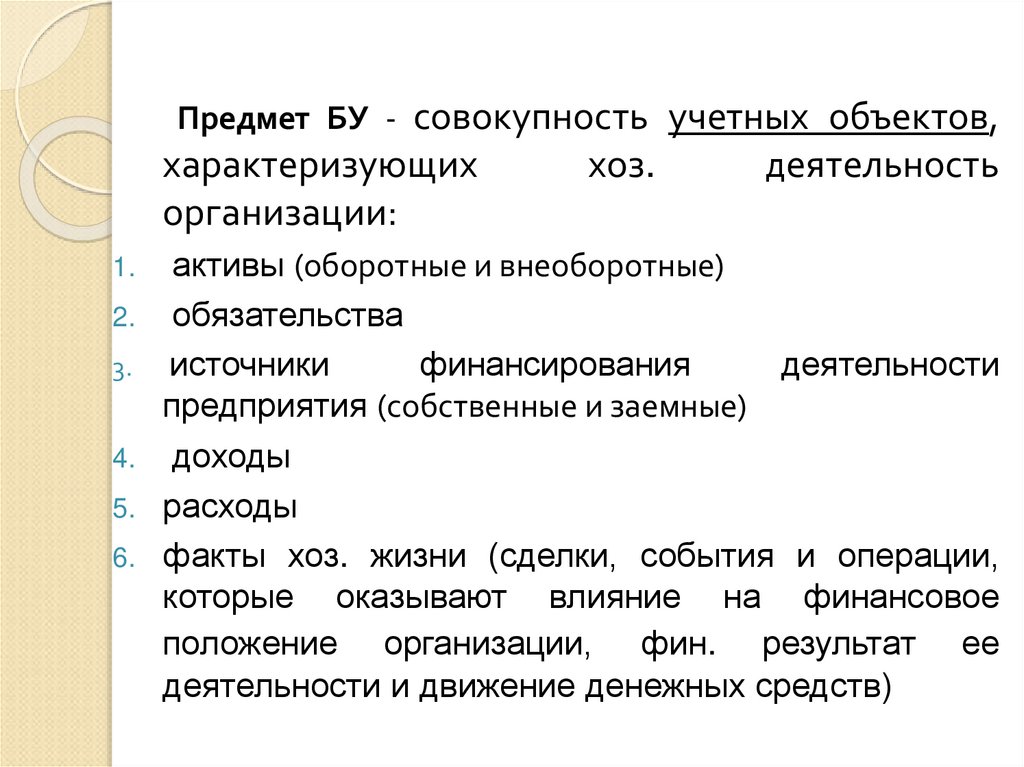 Предмет БУ - совокупность учетных объектов,характеризующих