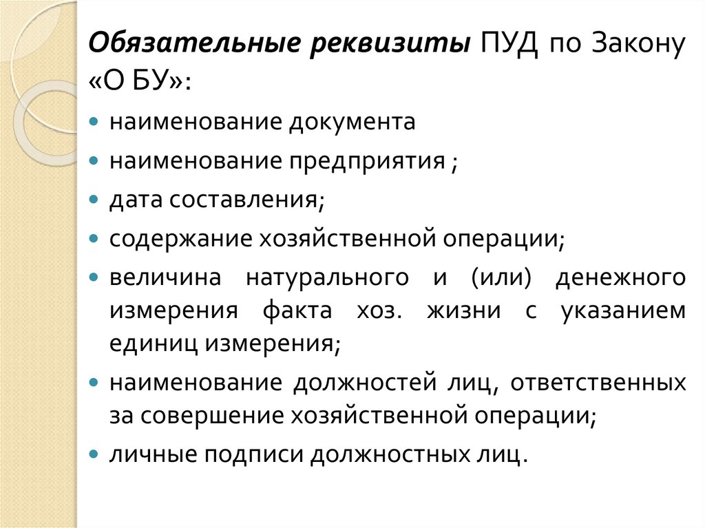 Обязательные реквизиты ПУД по Закону«О БУ»: