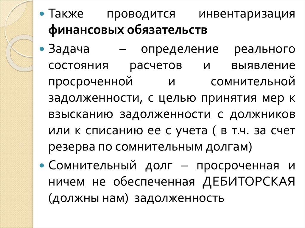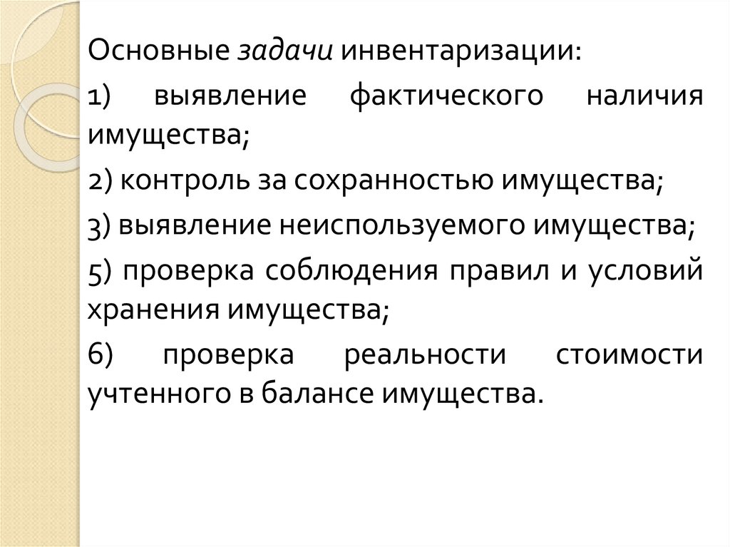 Основные задачи инвентаризации:1) выявление фактического наличия