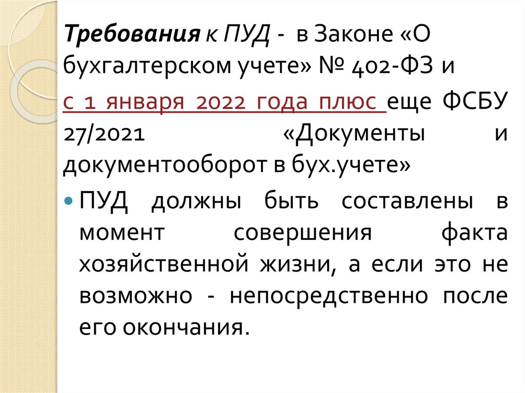 Требования к ПУД - в Законе «Обухгалтерском учете» № 402-ФЗ и