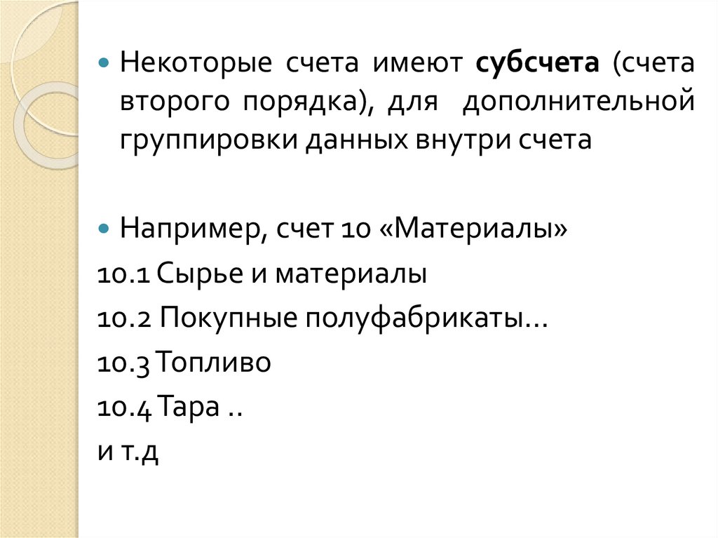 Некоторые счета имеют субсчета (счетавторого порядка), для дополнительной