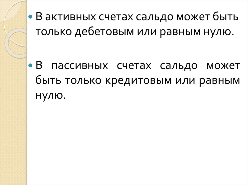 В активных счетах сальдо может бытьтолько дебетовым или равным нулю.