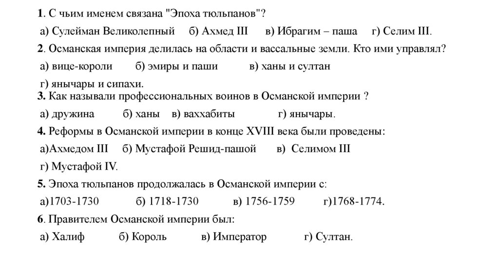1. С чьим именем связана "Эпоха тюльпанов"?а) Сулейман Великолепный