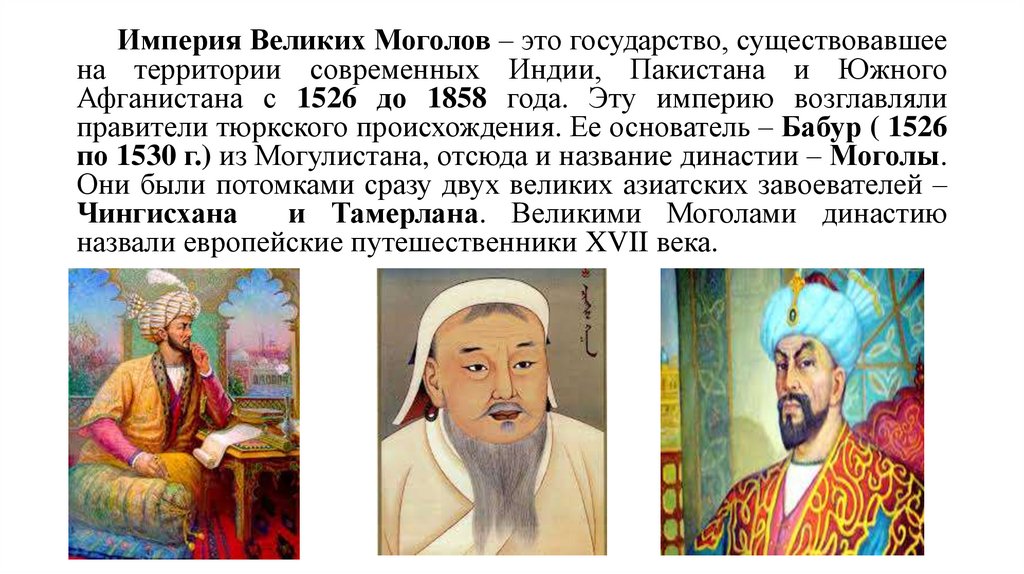 по 1530 г.) из Могулистана, отсюда и название династии – Моголы.
