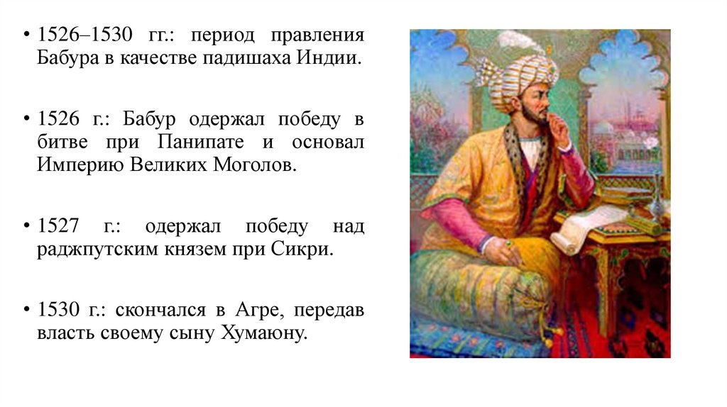 • 1526–1530 гг.: период правленияБабура в качестве падишаха Индии.